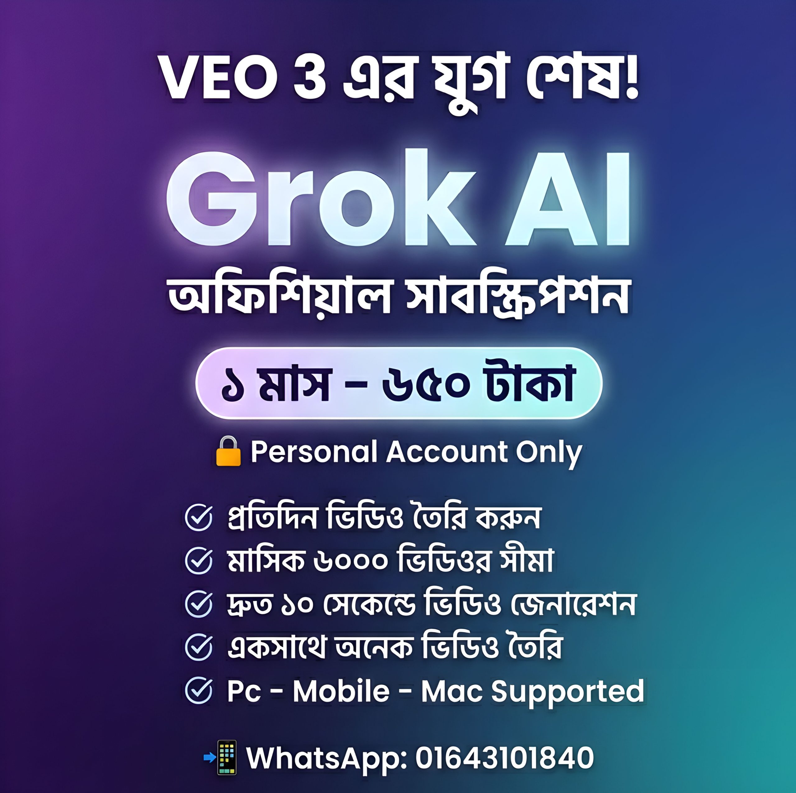 শেয়ার্ড অ্যাকাউন্টের সীমাবদ্ধতা আর ঝামেলা ভুলে যান। এখনই নিন Grok AI-এর অফিশিয়াল সাবস্ক্রিপশন এবং উপভোগ করুন ১০০% পার্সোনাল অ্যাকাউন্ট এক্সপেরিয়েন্স। এটি এমন একটি শক্তিশালী AI টুল যা আপনাকে খুব সহজেই সোশ্যাল মিডিয়ার জন্য শর্ট ভিডিও কনটেন্ট তৈরি করতে সাহায্য করবে।